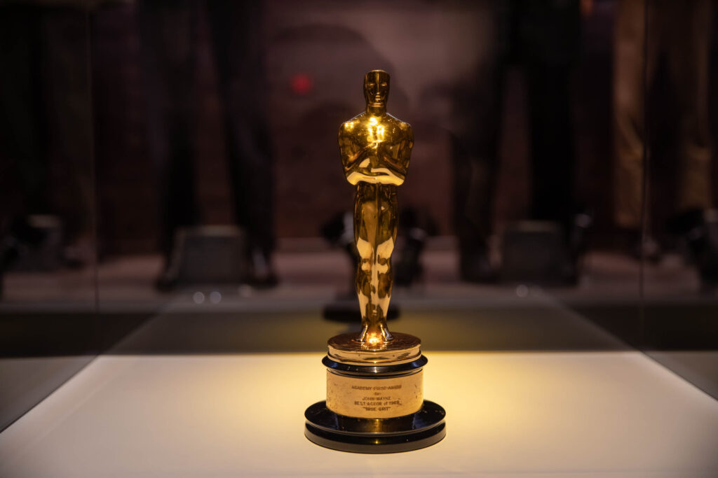 The centerpiece of the display is John Wayne’s Academy Award for Best Actor, presented at the 42nd Academy Awards in 1970 for his performance in True Grit. After decades of iconic roles in Western films, the award recognized Wayne’s portrayal of Rooster Cogburn as one of the defining performances of his career.